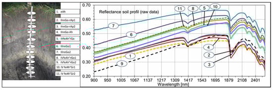 According to Demattê et al. [], Stenberg et al. [,], and Whiting et al. [], the bands at 1400, 1900, and 2000 nm are produced by OH-groups and water molecule movements, and reflection at 2200 nm indicates the existence of kaolinite and other silicates []. Ben–Dor [] described three major areas for clay minerals in general and smectite minerals, particularly around 1300–1400, 1800–1900, and 2200-2500 nm. According to Dotto et al. [], the reflections around 1400–1900 and 2200–2500 nm for 1:1 minerals (kaolinite) are relatively strong, while the signal at 1900 nm is very weak. The soils from this investigation were formed from complex alluvial sedimentation interrupted by the building of A-layers. The spectral behavior of the soil horizons and vertical discontinuities varied mainly according to the Ct content, particle size distribution (mainly sand distribution and clay mineral composition), and the condition of Fe oxides (oxides and oxyhydroxides). Fe oxides exist independent of the degree of reduction in these gleyic soils. To clarify this context, in Figure 5, the soil profile is contrasted with the spectral signatures for the 11 soil horizons and vertical discontinuities. The following findings can be derived: