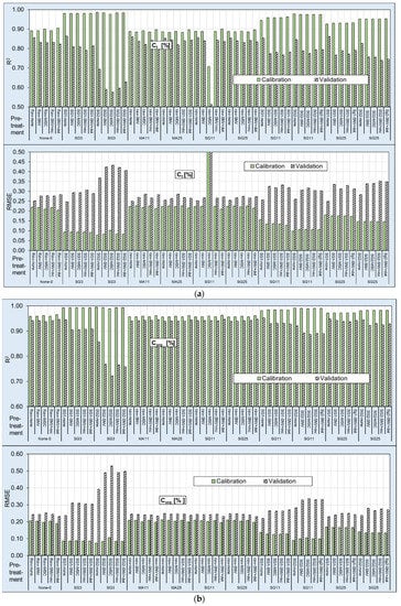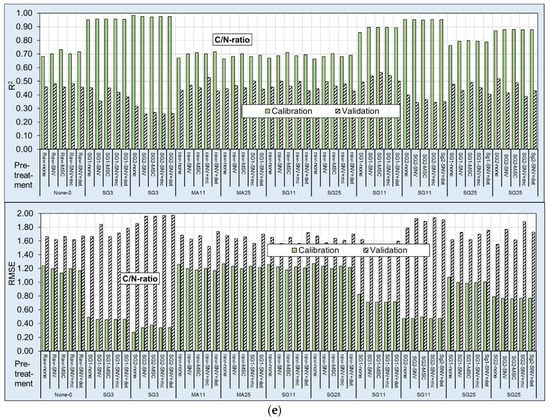 However, Viscarra Rossel and Lark [] noted that the application of derivations increased the fluctuations by calculating the gradients between adjacent readings. The results yielded strongly fluctuating values (Supplementary Materials, pre-processing techniques Figures S2 and S8). These fluctuations were also increased by the second derivation (Supplementary Materials, pre-processing techniques Figures S3 and S9). Therefore, not all the pre-processing methods were appropriate to improve the accuracy.