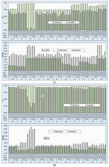 In this context, Bellon–Maurel and McBratney [] studied whether discrete variables are sufficient for the relevant calculations. The authors concluded that if the RPD values are over 2 and the R2 values are over 0.75, the models are sufficient. An additional option here was the development of low-cost wavelength-based sensors to measure organic C.