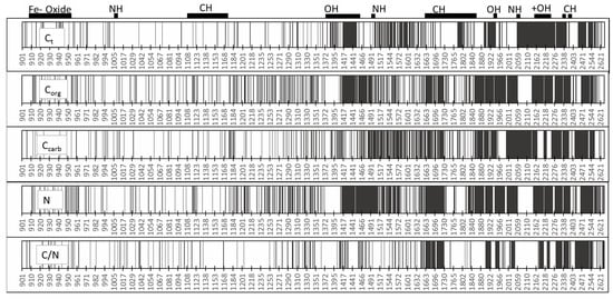 Figure 7 illustrates the most important wavelengths for the prediction of C and N. Notably, up to about 1400 nm, single wavelengths were most important. In contrast, above this value, the number of determining wavelengths/wavebands increased, and whole ranges became important. In the case of N and Corg, the regions of 1420–1730, 1840–2060, and 2160–2600 nm were nearly all (without any gaps) relevant for the predictions.