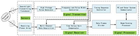 Figure 1 presents the overall architecture of the proposed multi-beam sonar system. The multi-beam sonar system is composed of a transducer array, signal transmitter, signal receiver and signal processor. The transmitter generates a high-voltage pulse signal to stimulate the transmitting transducer to project the ultrasonic pulse on the target sector. As the target object is at a particular position in the target sector, the underwater propagation impedance of the ultrasound is not continuous. The hydrophone array is excited by the reflected wave from the target object. After each ultrasonic pulse is transmitted, the receiver performs a certain time continuous synchronous data acquisition and TVG compensation for multiple hydrophone array elements according to the detection distance and divides the continuous received data into several signal frames on the basis of the pulse width of the ultrasonic signal. When a signal frame is received by the signal processor, the corresponding time delay compensation is carried out for each acquisition signal in multiple predetermined directions. Please note that all the echo signals are superimposed and summed to calculate the echo intensity in each direction which is then used to obtain the corresponding beam pattern.
