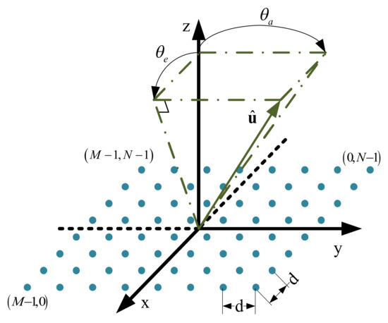 where, θe is used to represent the elevation angle, which is defined as the angle between vector and its projection on the YOZ plane. θa is used to represent the azimuth angle, which is defined as the angle between vector and its projection on the YOZ plane. Figure 2 intuitively depicts the definition of elevation and azimuth of a 2-D uniform plane array, which is conducive to the subsequent signal processing calculation.