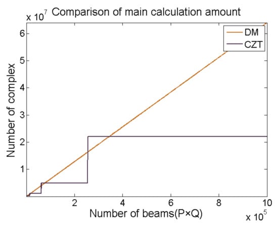 Although [22,23] compared the complexity of D&S, DM and CZT beamforming algorithms at the analytical level, and obtained the conclusion that the performance of CZT is always the optimal, according to Equations (3)–(5), some parameters of the three beamforming algorithms in the digital system can be initialized, and we found that the computational efficiency of DM was not completely lower than that of CZT. In the analytic formula, both D&S and DM are calculated in the form of 2-D multiplication and addition, but D&S is used to calculate beam signals with a time series sm,n(t), because k is fixed and DM is used to calculate beam signals with a complex parameter Sm,n(k). Thus, although the physical meaning of D&S is very obvious, when K is equal to 256, the computational efficiency of D&S will be lower than DM thoroughly. Therefore, we only discuss the computational efficiency of DM and CZT methods. Figure 3 compares the computational complexity of the digital signal processing system for achieving DM and CZT in various beam dimensions when M = N = 8. When P + 2M − 2 is less than L1 and Q + 2N − 2 is less than L2, CM,N and DP+M−1,Q+N−1 will be zero-padded to the size of L1 × L2, so we can find in Figure 3 that the calculation amount of CZT algorithm does not change with the increase of beam number in a certain region. We can also find that the computational efficiency of CZT is inferior to that of DM when P + 2M − 2 is slightly larger than a certain 2N+. In this work, because of P = Q = 90, thus, we can conclude that the CZT algorithm is the best choice.