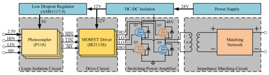 It is necessary for the transmitting module to achieve CW pulse generation at 190 dB sound source level and 100 KHz frequency. As shown in Figure 5, the high voltage pulse transmitting module is mainly composed of a DC-DC isolation power supply, photoelectric coupler, MOSFET driver, switching power amplifier, and impedance matching circuit. As the transmitter module produces continuous high-power pulse signal during its operations, the DC-DC isolation power supply of 12 V and 48 V is used to realize the electrical isolation with the total power supply.
