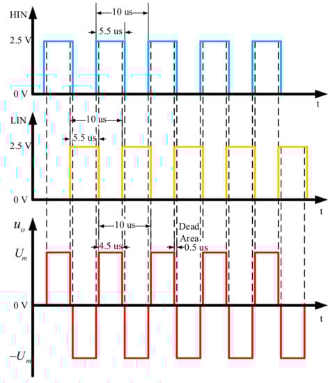 We select two IR2113S driver chips in the design of our drive circuit. The low voltage side of IR2113S is compatible with CMOS and TTL levels, the working voltage of high voltage side reaches 500 V, the maximum working current is 4 A, and the working frequency reaches 500 KHz. Through the control of HIN, LIN, SD logic signal, the drive circuit with power amplifier circuit produces 100 KHz high voltage alternating square wave. Figure 6 shows the relationship between the output waveform u0 of the power amplifier circuit and HIN, LIN, when the operating frequency is 100 KHz and the SD is logic high. Um represents the maximum output amplitude. The 0.5 μs dead time ensures that the four MOSFETs do not turn on at the same time. By changing the low-level duty cycle of the input logic signal we can realize the power adjustment. Since the ultrasonic transducer is a capacitive load, when u0 passes through the transducer with a resonant frequency of 100 KHz, the high-order harmonic attenuates. Finally, the acoustic signal in the form of 100 KHz sine wave is obtained.