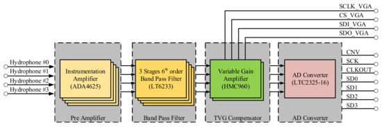 The design of acquisition module is based on four channels. Figure 8 shows the hardware structure of the acquisition module. This module comprises preamplifier, band-pass filter, variable gain amplifier, and analog-to-digital converter. The operating frequency f0 of the sonar system is 100 KHz, the receiving sensitivity SR of the planar piston hydrophone is −180 dB, the maximum operating distance Dmax is 40 m, the minimum operating distance Dmin is 5 m, the emission sound source level SL is 190 dB, and the receiving directional gain DIR is 3 dB.