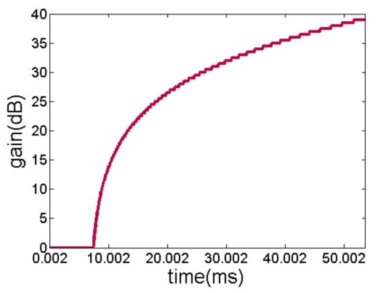 We compute the value of TVGrange = 39 dB. We choose HMC960 as the VGA of the acquisition module. It is noteworthy that HMC960 supports the gain variation of 0 to 40 dB for two signals within the bandwidth of 100 mHz. The minimum step of gain variation is 0.5 dB, and the minimum time interval for modifying the gain is 2 μs. The dynamic TVG compensation is realized by modifying the HMC960 gain controller with SPI in FPGA. Figure 9 shows the TVG configuration curve in a positioning cycle after the acquisition module is enabled, when the TS of object is 10 dB.