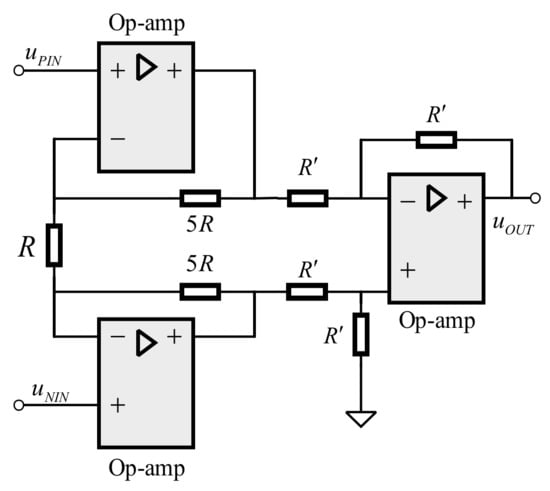 We calculate the amplification multiple of the conditioning circuit, the result of which is 1016. Since the conditioning circuit is composed of multi-stage analog circuits, there is an inevitable amplitude loss and because of the upper limit of gain value of HMC960 is 40 dB, thus, the first stage magnification is designed to be 11 times to meet the actual engineering requirements. As shown in Figure 10, the preamplifier circuit of the first stage uses three ADA4625 to form a differential instrument amplifier.