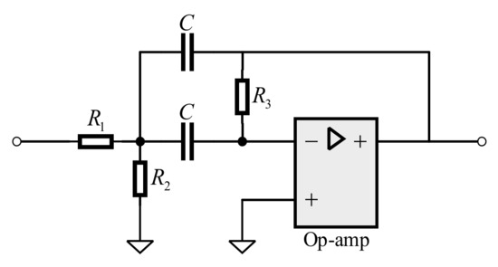 After the input signal of the acquisition module is amplified, the noise signal of the inclusion is also amplified. Since the system works under the narrow-band conditions, the band-pass filter is used for the second-stage signal conditioning. In order to obtain the flat passband and steep stopband, we cascade three Butterworth second-order multi-feedback (MBF) bandpass filters. This is presented in Figure 11.