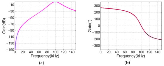 where, A(jf0) denotes the passband gain coefficient, and QB denotes the quality factor of the filter. Figure 12a shows the amplitude-frequency response of the cascaded bandpass filter, and Figure 12b shows the corresponding phase-frequency response. The passband bandwidth is 30 KHz. Ideally, the passband gain is 0 dB, and the phase shift at 100 KHz is 0°.