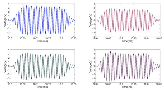 where S0 represents the receiver sensitivity of a standard hydrophone. The value of S0 for the standard hydrophone used in the experiment performed in this work is −177 dB at 100 KHz. Figure 21 shows the acoustic signal received by the standard hydrophone. The resultant value of UFP is 4.6 V. The actual sound source level of the transmitter is 190.25 dB as devised from Equation (23).