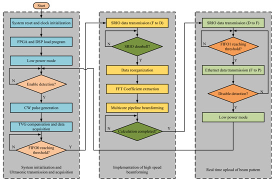 For real-time signal processing systems, we must meet the condition that the acquisition time interval of each echo signal frame is equal to the upload time interval of each beam pattern. Therefore, in the software design of real-time systems, we must plan the data flow in the FPGA reasonably and improve the throughput of signal processing in the DSP as much as possible.