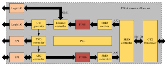 Figure 15 shows the resource allocation used in the FPGA. In short, the FPGA is mainly responsible for the realization of Gigabit Ethernet communication, timing control of transmission and acquisition, generation of CW pulse logic signal, multi-channel TVG compensation, synchronous data acquisition, and management of FIFO and SRIO interfaces. It is necessary that these functions operate in a parallel state, so an XC7K325T with sufficient I/O, logic cell, and high-speed serial interface is a very suitable choice. The DSP is mainly responsible for the management of SRIO interface, the FFT coefficient extraction of data collected by each channel, the response of doorbell interrupt, and the efficient and rapid implementation of 2-D CZT beamforming algorithm.
