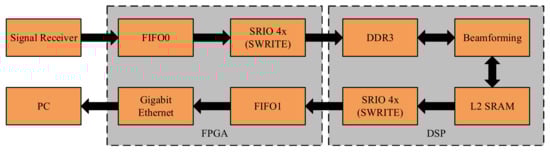 Figure 16 shows the transmission path of acquired data in the software system. From the FPGA module to DSP module, given the time length of the echo signal frame is 256 μs, the binary data length of a single sampling channel is 16 bit, and the sampling rate is 1 Msps, the total amount of data for each echo signal frame is 32 KB. When the underwater velocity is 1500 m/s, the space distance Corresponding to a signal frame is 0.384 m, and the shortest echo receiving time interval is 512 μs. When the FPGA adopts the SRIO interface in the form of Direct I/O, the actual transmission rate of sending SWRITE package is 1795 MB/s, and the transmission of 32 KB data requires 17.408 μs. Please note that the depth of FIFO0 is greater than 32 KB. The threshold set to 32 KB enables FPGA to DSP real-time data transmission. For the data stream going from DSP module to FPGA module and then to PC, each element in the 2-D beam pattern is 16 bits in length and the number of beams is 90 × 90. The volume of a beam pattern data is 16,200 B.