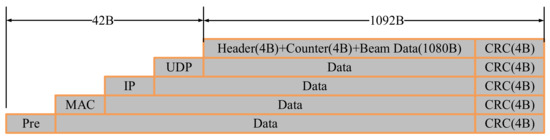 Figure 17 presents the Gigabit Ethernet IP message format in FPGA. A beam pattern is transmitted by using 15 IP packets. The total length of each IP packet is 1134 B. Therefore, the ideal time for Gigabit Ethernet to send 15 IP packets is 8.66 μs, so the fixed depth of FIFO1 is 2048 B, and the threshold is 1080 B. In order to achieve the purpose of real-time data transmission, the minimum time interval TB of beamforming should satisfy the expression presented in Equation (20):