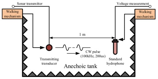 In an anechoic tank, we place the standard hydrophone at a distance of 1 m from the acoustic axis of the transmitting transducer by mechanical walking mechanism. The transmitter is used to excite the transmitting transducer to generate CW ultrasonic signals with a frequency of 100 KHz, a pulse width of 200 μs and with the repetition period of 5 s. The open circuit RMS voltage of the standard hydrophone is UFP. The calculation method of sound source level LSP is expressed as follows: