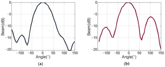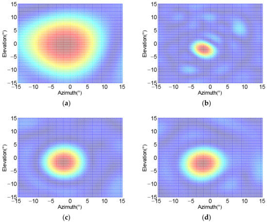 where, θei and θai represent the scanning start points of elevation and azimuth, respectively and θef and θaf represent the scanning endpoints of elevation and azimuth, respectively. In addition, it is necessary that , and P × Q are the total number of beam signals in frequency domain, and Δsc represents the sine value of the elevation angle resolution, and Δsa represents the sine value of the azimuth angle resolution. When k is given, Equation (5) is expressed by the two-dimensional discrete linear convolution of CM,N and DP+M−1,Q+N−1 matrices as presented in Equation (8):