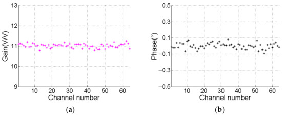 Second, the phase and amplitude consistency of each channel in the receiver system are the key factors that affect the positioning accuracy. We turn off the TVG compensation function of the sonar system and connect all the channels of the receiver to the same signal source. In addition, we adjust the output peak value of the signal source to 50 mV and frequency to 100 KHz continuous sine wave. Figure 25a shows the amplitude gain coefficient of each channel at 100 KHz. When channel 43 is defined as the reference channel, Figure 25b shows that the phase difference between the other channels and the reference channel is less than 0.2° and the maximum amplitude consistency error is −6.55 dB. The material error of the resistance and capacitance of the analog circuit is the major cause of the amplitude and phase error. In non-extreme working environments, the amplitude gain coefficient ratio and phase difference between each channel and the reference channel are considered to be constant. The error correction is realized by using Equation (21).