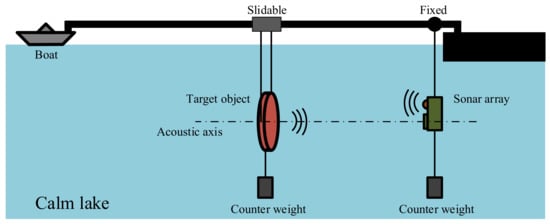 Figure 26 shows the schematic diagram of the positioning experiment. The target object in the positioning experiment is a circular baffle with a TS of 10 dB. The baffle and the sonar array are suspended on the fixed bracket in such a way that the baffle is placed in the central acoustic axis of the receiving array. First, the baffle is placed at a distance of 5 m from the sonar array.