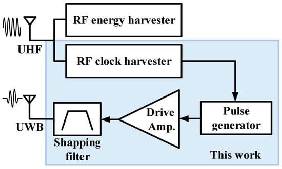 - Mao, J.; Zou, Z.; Zheng, L.R. A Subgigahertz UWB Transmitter with Wireless Clock Harvesting for RF Powered Applications. IEEE Trans. Circuits Syst. 2014, 61, 314–318. [Google Scholar] [CrossRef]