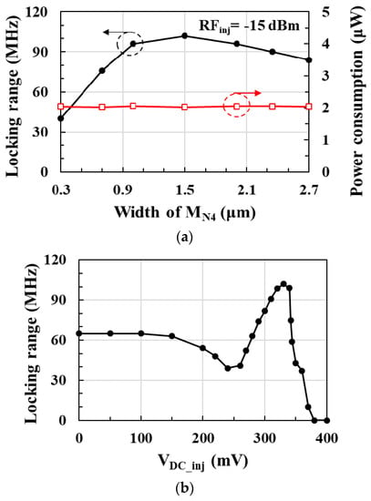 - Tang, N.L.; Yi, J.E.C. A 0.8-mW 55-GHz dual-injection-locked CMOS frequency divider. IEEE Trans. Microw. Theory Tech. 2008, 56, 620–625. [Google Scholar] [CrossRef]