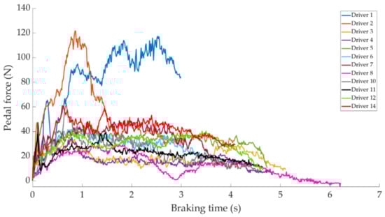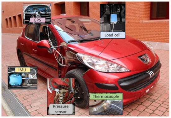 The force exerted by the driver on the brake pedal during the braking is gathered employing the load cell installed on the pedal (see Figure 4). This sensor has been used as a “trigger” to start the signal from the other sensors.