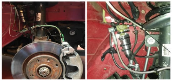 The pressure sensor was installed in the hydraulic circuit of the braking system with the aim to determinate the braking capacity of the system. In order to measure the pressure as close as possible to the brake calliper system, the pressure sensor was fixed between the brake calliper inlet and the last section of the hydraulic brake circuit, with the idea of avoiding pressure fluctuations during braking. In addition, this set up ensures that there is not interfere with other parts of the vehicle (steering, suspension, etc.) (see Figure 2). It is a PDCR 911 model by Druck Limited with an operating range from 0 to 135 bar. The pressure applied to the sensor produces a deflection of the diaphragm, which flexes the full-bridge gauges, producing a measurable voltage difference proportional to the measured pressure.