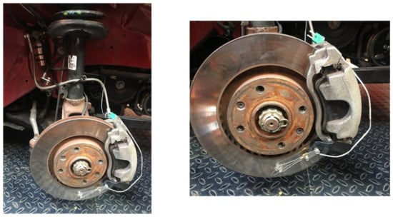 Since dynamic tests are to be carried out on the track, the brakes reach high temperatures during operation. As is known, the temperature greatly affects the braking efficiency of the vehicle. The brake disc was instrumented to measure the temperature during the tests by installing a thermocouple K type (see Figure 7). The thermocouple is from TC DIRECT with mineral insulation of 0.5 mm diameter. The temperature range is from 0° to 850° and the time constant is 0.03 s.