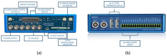(a) Analogue and digital inputs and outputs available on the VBOX 3i Dual Antenna; (b) Inputs of the external VBOX Mini Input module.