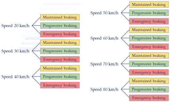 The experimental tests are designed to reproduce all types of braking that can happen while driving a vehicle. The braking of the car is largely dependent on the brake pedal exertion. Although many different situations may arise, the most frequent frames are: when the driver maintains the brake pedal in the same position (maintained braking), when the driver slowly increases the pressure on the pedal (progressive braking) and when the driver brakes sharply (emergency braking). More information related to the braking situations is explained in the Section 3.2.1. These situations can be applied and hybridize according to the speed and desires of the driver.