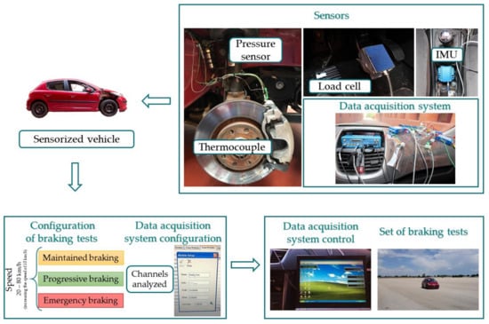 All tests were carried out at the tracks of the National Institute of Aerospace Technology (INTA), which dimensions are 300 × 250 m and paves with asphalt. The driver shall perform a series of braking with the vehicle until it stops, following a straight path. The kinds of braking that the driver must performed were: maintained, progressive and emergency braking. Moreover, it is important to underline that the speed car moved between 20 and 80 km/h, increasing the speed of 10 km/h between experiments.