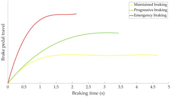 Three types of braking have been proposed, which are intended to cover all driving circumstances in which the braking system may be involved: maintained, progressive and emergency. These types of braking have made it possible to define three driving styles. Maintained type braking is achieved by exerting a single pressure on the brake pedal and maintaining it until the vehicle stops. For progressive braking, the driver gradually increases the pressure on the brake pedal until the vehicle stops. Finally, emergency braking is achieved by firmly pressing the brake pedal until the end of its travel. In that way, maintained braking is the most “moderate” of the three and has been associated with a “cautious” driving style. The “usual” braking manoeuvre corresponds to progressive braking and is considered a “normal” driving style. Finally, emergency braking is described as “hard” and is attributed to an “aggressive” driving style.