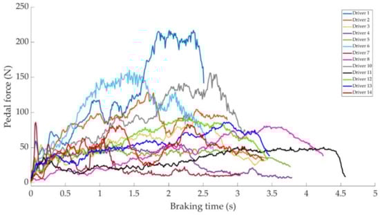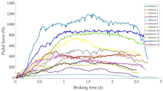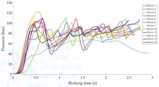 The data acquired in the experimental tests made it possible to satisfactorily relate the driving speed, the type of braking and the manner in which the driver performs the braking manoeuvre to the reading of the various sensors on board the vehicle. The direct readings of the different sensors for the different test conditions have provided relevant information and have confirmed that the parameters chosen to characterise the driver’s behaviour are appropriate. The figures shown in Section 4.1 demonstrate that each driver has his own driving style when performing any of the three types of braking manoeuvre. The type of braking for which drivers differ the most is emergency braking. Figure 20 shows how drivers apply forces of different magnitudes to the brake pedal. Figure 18, Figure 19 and Figure 20, for progressive braking, show that drivers 1, 2, 6, 7, 10 and 14 apply more force to the brake pedal at the start of braking to reduce speed immediately and then apply a lighter force until the vehicle stops, than drivers 3, 4, 5, 8, 11, 12 and 13 who apply a lighter brake pedal at the start of braking and then gradually apply more force until the vehicle is stopped. The maintained type of braking is the one in which the least differences are seen between the different drivers, see Figure 14, Figure 15 and Figure 16, excluding drivers 1 and 2 who do not maintain pressure on the brake pedal to perform a braking of this type correctly. Table 3, Table 4 and Table 5 show the increasing average of the values recorded by each sensor due to the increase in speed, for the three types of braking. For the same test speed, the minimum values collected correspond to maintained type braking, followed by progressive type braking and, finally, the maximum values are those recorded for emergency braking.