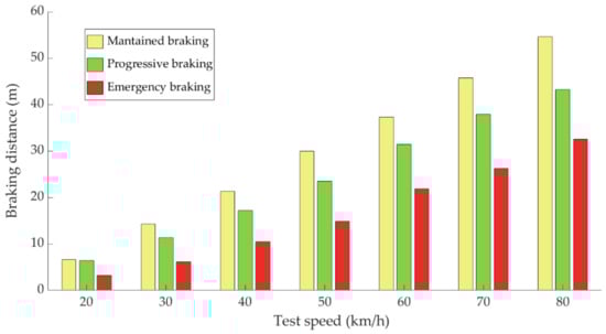 Experimental tests have been carried out for driving on a straight line on flat ground for each type of braking: maintained, progressive and emergency; for a range of speeds between 20 and 80 km/h, increasing the speed in 10 km/h intervals. The driver moves forward with the vehicle until the test speed is reached and at the moment when the speed is constant, the braking process begins.