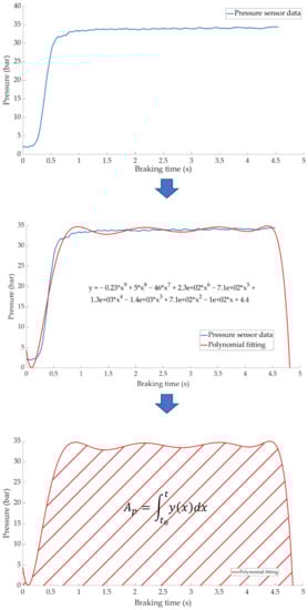 The data analysis methodology to perform the classification of the different types of braking consists of calculating the area enclosed under the curves of pressure in the brake circuit, force exerted by the driver, vehicle deceleration and kinetic energy. The first step is to fit the curves representing the temporal evolution of the measurements obtained by the sensors during each braking to a polynomial. Once the fitting function is known, it is possible to calculate the area enclosed under the curve. The area is defined as the integral of the fitted function from the start of braking to the end of braking and provides significant information regarding the magnitude of the braking (see Figure 25).