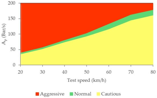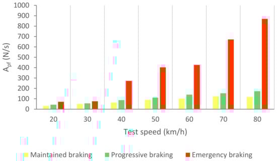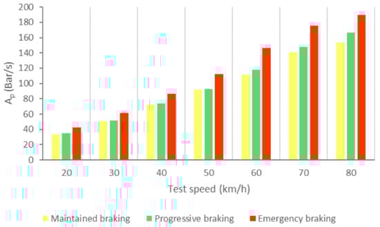 Figure 26 shows the calculated average area of the pressure in the brake circuit (Ap) for the three types of braking and different test speeds.