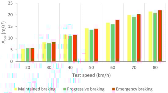 Figure 30 shows the calculated average area relating to the deceleration curves (Adec) for the three types of braking and different test speeds.