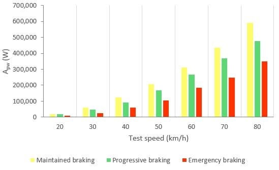 The integral of the kinetic energy curve between the time limits makes possible to assess the power developed by the brake. In Table 9 it is shown the average braking power in each kind of braking manoeuvre and test speeds for all 14 drivers. The power increases as the test speed increases and according to the type of braking in the following order: maintained, progressive and emergency.