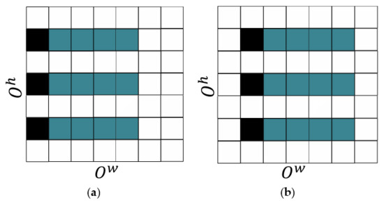 The illustration of the process described in Equation (4) using and processing two consecutive patches of . Squares coloured with cyan signify the elements participating at the processing of , and coloured with grey are the elements of . (a) Processing of ; (b) Processing of .