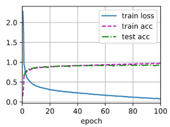 As shown in Figure 8, in the process of model training, there is no over-fitting or under-fitting phenomenon, and there is no gradient disappearance or gradient explosion. By using the model with measured data, the final training result is that the recognition accuracy of the training data and the test data is 95.9% and 90.9%, respectively, which shows that the model has a high recognition accuracy.