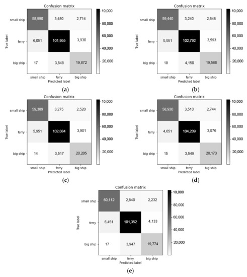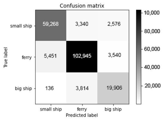 As shown in Table 6, the F1 score of this model is very good, indicating that this model has good classification accuracy and stability. The results of small boat class and ferry class are better, with F1 score of 0.91 and 0.93 respectively. The worst results are for the big ship class, with an accuracy of 0.76, a recall rate of 0.83, and an F1 score of 0.80. It could be that the mechanical systems of the boats are similar to those of ferries, or some boats were passing by during the collection of ferry samples.