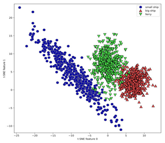 The manifold learning algorithm is used to carry out complex mapping of 100-dimensional feature vectors extracted from all samples, and a good visual 2-dimensional vector is obtained. We use the t-SNE algorithm to visualize the feature vectors of underwater acoustic targets. Figure 13 shows the scatter plot of the two-dimensional vector obtained from the complex mapping of 100 feature vectors. Here, we use the corresponding number of each class as a symbol to show the position of each class. It can be seen that each class is relatively well separated, indicating that the feature results extracted by the model have a good clustering effect, and visually proving that the feature extracted by the underwater acoustic target has good separability and stability.