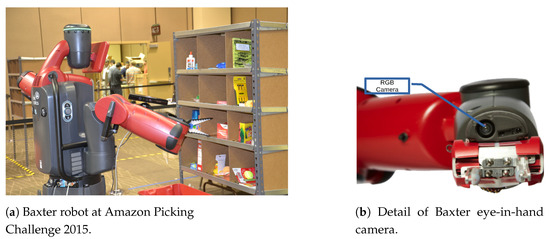 In this paper, we address the above issues by means of new methods and the incorporation of models and prior knowledge based on active vision. The specific robotic problem we solve here is monocular depth estimation in an eye-in-hand configuration. The main goal here is to pick and place objects for which the depth cue is the necessary starting point for most grasping algorithms [5,6,7]. This problem arises in applications such as warehouse automation for which adequate datasets are nonexistent (for instance the most popular datasets for depth estimation such as the KITTI dataset [8] or the Pandora dataset [9] are oriented to depth estimation by vehicles). Additionally, manipulation in a confined space would require an RGB-D sensor in hand and, even though state-of-the-art RGB-D cameras are more compact, they are not comparable with the Baxter fully integrated built-in eye-in-hand cameras (see Figure 1a,b). In addition, RGB-D sensors have problems with reflective and transparent objects [10,11]. Our goal is, then, not so much to replace existing 3D sensors but to complement them in situations where there may exist some difficulty in using them. The proposed algorithms allow—using deep learning techniques—to estimate the depth in a static scene from small displacements of a more compact sensor, such as an RGB camera.