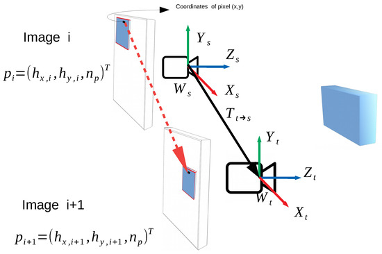 An object is projected onto the image plane of the camera in two consecutive instants (i, i + 1) after a displacement () taking as reference the frame source (s) of the camera () and considering the target (t) frame of the camera (), the displacement of the pixel () in homogeneous coordinates , and (near camera plane), is determined by the difference between the position of the pixel in the images (i + 1) and (i), i.e., . x and y denote the coordinates of the pixel in the image plane.