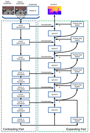 The architecture of this network is based on a simple convolutional neural network (CNN). To combine multiple inputs in CNN, a simple choice is to stack all inputs together and feed the CNN with them. This network is illustrated in Figure 3 and we call this architecture depthS. DepthS is based on FlowNetSimple [37], an approach that fits well with our needs, based on our previous experience. First, depthS concatenates these inputs and convolves them three times before the contracting part. The contracting part is composed of multiple convolutional layers to abstract feature maps. After the contracting part, the feature maps are extended in the expanding part to generate a final depth map. The expanding part is mainly composed of up-convolutions, consisting of unpooling and convolutional layers (Figure 3). To refine the predicted depths, we concatenate the deconvoluted feature maps with two corresponding feature maps: the feature maps from the contracting part of the network, and an upsampled coarser depth prediction. For instance, in Figure 3, the output of upconv3 is concatenated with the products of conv3_1 and depth4. We repeat this process 5 times. This method of deconvolution was previously used by other researchers [21,22,38]. The contracting and expanding parts are similar to those in [37], though we had to adjust them since the number of inputs is different.