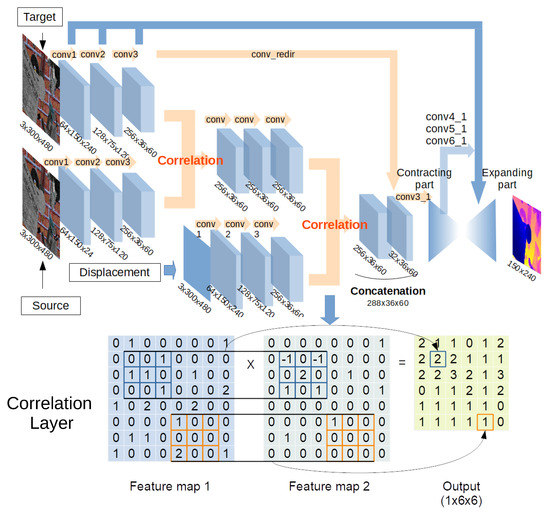 The correlation layer is used to associate two feature maps patch by patch [37]. It convolves a feature map with another map similarly to one step of convolution in a CNN, with the important difference that a CNN convolves inputs with weights, whereas there are no weights in the correlation layer.