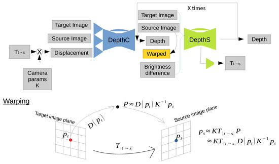 Thus, depthS processes a pair of images, a predicted depth map, a warped image, and brightness differences together, and it generates an improved depth map and a new relative pose . The new is calculated from the subconvolutional network diverging from the mid of depthS. We iterate depthS multiple times so that depth maps and relative poses are improved repeatedly. The updated relative pose and predicted depth map are used to compute a new warped image and brightness difference with Equations (3) and (5). Next, depthS processes the new warped image and brightness differences along with a pair of images and previously predicted depth maps repeatedly.