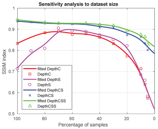 Finally, our results have been obtained with an ad-hoc dataset that is one or two orders of magnitude smaller than the typical datasets used in deep learning. This fact suggests that the incorporation of prior knowledge and sensor models relative to robotic active vision can contribute to the development of sample-efficient deep learning by significantly reducing the size of the required datasets. The results of our sensitivity analysis to dataset size clearly confirm this claim, since with only 3000 samples the SSIM index is already over 0.9 for depthCS and depthCSS and it keeps over 0.8 for only 1000 samples (Figure 8). This promising results suggest the feasibility of physically generating the ad-hoc data in the real world in the near feature, and resorting to data augmentation when necessary.
