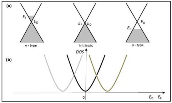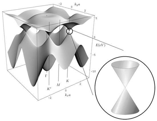 Graphene is a two-dimensional (2D) material with a monolayer of sp2-bonded carbon atoms. Electrons are delocalized and free to move in this 2D sheet. The energy band structure of graphene is illustrated in Figure 1 []. The valence and conduction bands of graphene are conical valleys, which are attached at Dirac points. The energy dispersion curve is linear around the Dirac points, leading to an extremely large mobility of the charge carriers. Pristine graphene is a zero band-gap semiconductor, and its Fermi level is located at the Dirac point, corresponding to zero conductivity at T = 0 K under vacuum []. In practical situations, graphene possesses defects that cause a p-type doping []. The zero or quasi-zero bandgap of pristine graphene can be a hurdle to use it as a sensing layer []. However, the electron transfer with target gas molecules leads to the Fermi level shift. More precisely, when graphene reacts with electron-donor or electron-acceptor gas molecules, the zero conductivity disappears. Moreover, doping or defects can also shift the Fermi level, which makes graphene become a p-type or n-type semiconductor.