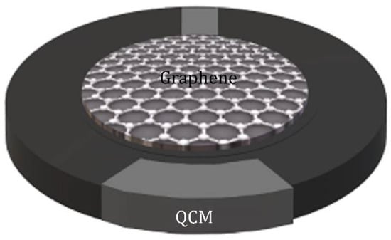 Mass sensitive sensor is a transducing device with a sensitive layer. After the sensitive layer adsorbing the target gas, the device gives a signal related to the mass uptake of this layer. The sensors are divided in quartz crystal microbalance (QCM) sensors [] and surface acoustic wave (SAW) sensors []. The working principle of the QCM sensor is based on the change in mass or thickness of the sensitive layer adhering to the surface of a quartz crystal. Specifically, the resonance frequency of the QCM sensor changes with the concentration of the target gas adsorbed on the sensitive layer. As shown in Figure 2, the QCM piezoelectric system is composed of a quartz crystal resonator disc with electrodes deposited on each side. When NH3 molecules adsorb on the functionalized graphene surface over the quartz crystal surface, the resonant frequency of the resonator varies proportionally with the mass of NH3 adsorbed on the sensing layer. The change in the resonance frequency is used to measure the mass of adsorbed NH3 by using the Sauerbrey equation []:
